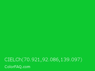 CIELCh 70.921,92.086,139.097 Color is a normal green color and the nearest color is Vivid Malachite #00cc33. Hex code #0dc930 and RGB value is rgb(13,201,48). In RGB color space, this color is composed of 5% red, 79% green, 19% blue, In CMYK color space, this color is composed of 94% cyan, 0% magenta, 76% yellow , 21% black , In HSL color space, this color has a hue angle of 131° , 88% saturation and 42% lightness.