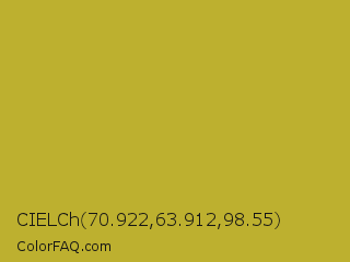 CIELCh 70.922,63.912,98.55 Color is a normal yellow color and the nearest color is Hokey Pokey #c8a528. Hex code #bdb02f and RGB value is rgb(189,176,47). In RGB color space, this color is composed of 74% red, 69% green, 18% blue, In CMYK color space, this color is composed of 0% cyan, 7% magenta, 75% yellow , 26% black , In HSL color space, this color has a hue angle of 55° , 60% saturation and 46% lightness.