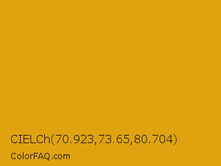 CIELCh 70.923,73.65,80.704 Color is a normal orange color and the nearest color is Gamboge #e49b0f. Hex code #e0a30f and RGB value is rgb(224,163,15). In RGB color space, this color is composed of 88% red, 64% green, 6% blue, In CMYK color space, this color is composed of 0% cyan, 27% magenta, 93% yellow , 12% black , In HSL color space, this color has a hue angle of 42° , 87% saturation and 47% lightness.