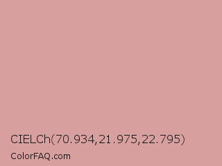 CIELCh 70.934,21.975,22.795 Color is a light red color and the nearest color is Parrot Pink #d998a0. Hex code #d7a09f and RGB value is rgb(215,160,159). In RGB color space, this color is composed of 84% red, 63% green, 62% blue, In CMYK color space, this color is composed of 0% cyan, 26% magenta, 26% yellow , 16% black , In HSL color space, this color has a hue angle of 1° , 41% saturation and 73% lightness.