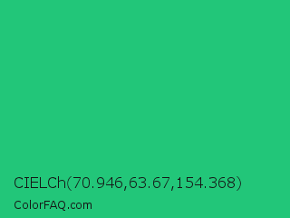 CIELCh 70.946,63.67,154.368 Color is a normal green color and the nearest color is Mountain Meadow Crayola #1ab385. Hex code #22c679 and RGB value is rgb(34,198,121). In RGB color space, this color is composed of 13% red, 78% green, 47% blue, In CMYK color space, this color is composed of 83% cyan, 0% magenta, 39% yellow , 22% black , In HSL color space, this color has a hue angle of 152° , 71% saturation and 45% lightness.