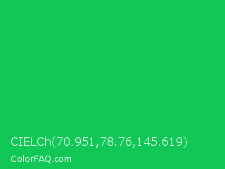 CIELCh 70.951,78.76,145.619 Color is a normal green color and the nearest color is Malachite #0bda51. Hex code #11c857 and RGB value is rgb(17,200,87). In RGB color space, this color is composed of 7% red, 78% green, 34% blue, In CMYK color space, this color is composed of 92% cyan, 0% magenta, 57% yellow , 22% black , In HSL color space, this color has a hue angle of 143° , 84% saturation and 43% lightness.