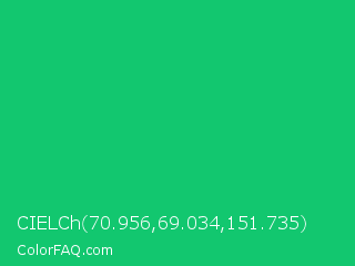 CIELCh 70.956,69.034,151.735 Color is a normal green color and the nearest color is Green Crayola #1cac78. Hex code #12c76f and RGB value is rgb(18,199,111). In RGB color space, this color is composed of 7% red, 78% green, 44% blue, In CMYK color space, this color is composed of 91% cyan, 0% magenta, 44% yellow , 22% black , In HSL color space, this color has a hue angle of 151° , 83% saturation and 43% lightness.