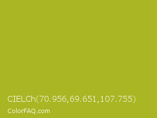 CIELCh 70.956,69.651,107.755 Color is a normal yellow color and the nearest color is Acid Green #b0bf1a. Hex code #aab623 and RGB value is rgb(170,182,35). In RGB color space, this color is composed of 67% red, 71% green, 14% blue, In CMYK color space, this color is composed of 7% cyan, 0% magenta, 81% yellow , 29% black , In HSL color space, this color has a hue angle of 65° , 68% saturation and 43% lightness.