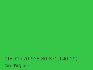 CIELCh 70.958,80.871,140.59 Color is a normal green color and the nearest color is Lime Green #32cd32. Hex code #37c748 and RGB value is rgb(55,199,72). In RGB color space, this color is composed of 22% red, 78% green, 28% blue, In CMYK color space, this color is composed of 72% cyan, 0% magenta, 64% yellow , 22% black , In HSL color space, this color has a hue angle of 127° , 57% saturation and 50% lightness.