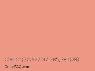 CIELCh 70.977,37.785,38.028 Color is a light red color and the nearest color is Tonys Pink #e79f8c. Hex code #ed9885 and RGB value is rgb(237,152,133). In RGB color space, this color is composed of 93% red, 60% green, 52% blue, In CMYK color space, this color is composed of 0% cyan, 36% magenta, 44% yellow , 7% black , In HSL color space, this color has a hue angle of 11° , 74% saturation and 73% lightness.