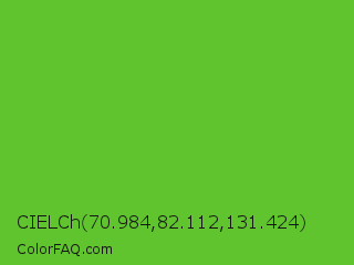CIELCh 70.984,82.112,131.424 Color is a normal green color and the nearest color is Green RYB #66b032. Hex code #60c42e and RGB value is rgb(96,196,46). In RGB color space, this color is composed of 38% red, 77% green, 18% blue, In CMYK color space, this color is composed of 51% cyan, 0% magenta, 77% yellow , 23% black , In HSL color space, this color has a hue angle of 100° , 62% saturation and 47% lightness.