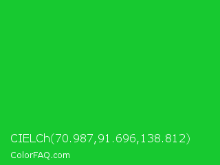 CIELCh 70.987,91.696,138.812 Color is a normal green color and the nearest color is Vivid Malachite #00cc33. Hex code #17c930 and RGB value is rgb(23,201,48). In RGB color space, this color is composed of 9% red, 79% green, 19% blue, In CMYK color space, this color is composed of 89% cyan, 0% magenta, 76% yellow , 21% black , In HSL color space, this color has a hue angle of 128° , 79% saturation and 44% lightness.