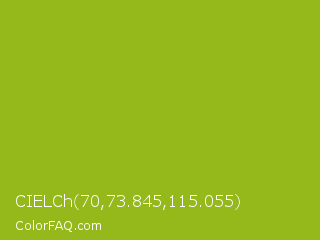CIELCh 70,73.845,115.055 Color is a normal lime color and the nearest color is Citron #9fa91f. Hex code #95b81b and RGB value is rgb(149,184,27). In RGB color space, this color is composed of 58% red, 72% green, 11% blue, In CMYK color space, this color is composed of 19% cyan, 0% magenta, 85% yellow , 28% black , In HSL color space, this color has a hue angle of 73° , 74% saturation and 41% lightness.
