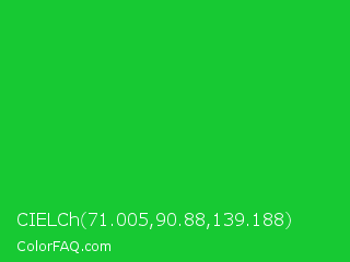 CIELCh 71.005,90.88,139.188 Color is a normal green color and the nearest color is Vivid Malachite #00cc33. Hex code #17c933 and RGB value is rgb(23,201,51). In RGB color space, this color is composed of 9% red, 79% green, 20% blue, In CMYK color space, this color is composed of 89% cyan, 0% magenta, 75% yellow , 21% black , In HSL color space, this color has a hue angle of 129° , 79% saturation and 44% lightness.