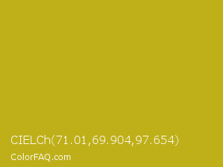 CIELCh 71.01,69.904,97.654 Color is a normal yellow color and the nearest color is Sahara #b7a214. Hex code #bfb01a and RGB value is rgb(191,176,26). In RGB color space, this color is composed of 75% red, 69% green, 10% blue, In CMYK color space, this color is composed of 0% cyan, 8% magenta, 86% yellow , 25% black , In HSL color space, this color has a hue angle of 55° , 76% saturation and 43% lightness.