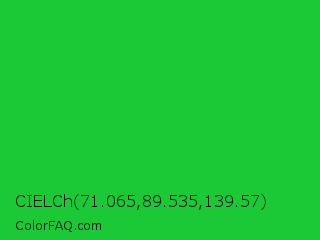 CIELCh 71.065,89.535,139.57 Color is a normal green color and the nearest color is Lime Green #32cd32. Hex code #1bc937 and RGB value is rgb(27,201,55). In RGB color space, this color is composed of 11% red, 79% green, 22% blue, In CMYK color space, this color is composed of 87% cyan, 0% magenta, 73% yellow , 21% black , In HSL color space, this color has a hue angle of 130° , 76% saturation and 45% lightness.
