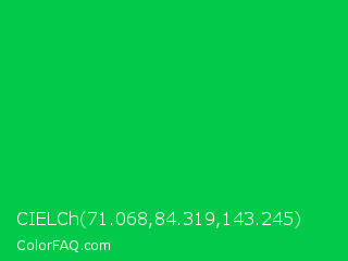CIELCh 71.068,84.319,143.245 Color is a normal green color and the nearest color is Dark Pastel Green #03c03c. Hex code #03c94a and RGB value is rgb(3,201,74). In RGB color space, this color is composed of 1% red, 79% green, 29% blue, In CMYK color space, this color is composed of 99% cyan, 0% magenta, 63% yellow , 21% black , In HSL color space, this color has a hue angle of 142° , 97% saturation and 40% lightness.