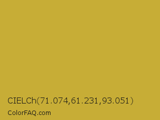 CIELCh 71.074,61.231,93.051 Color is a normal yellow color and the nearest color is Old Gold #cfb53b. Hex code #c7ad36 and RGB value is rgb(199,173,54). In RGB color space, this color is composed of 78% red, 68% green, 21% blue, In CMYK color space, this color is composed of 0% cyan, 13% magenta, 73% yellow , 22% black , In HSL color space, this color has a hue angle of 49° , 57% saturation and 50% lightness.