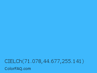 CIELCh 71.078,44.677,255.141 Color is a light blue color and the nearest color is Picton Blue #45b1e8. Hex code #3db8fc and RGB value is rgb(61,184,252). In RGB color space, this color is composed of 24% red, 72% green, 99% blue, In CMYK color space, this color is composed of 76% cyan, 27% magenta, 0% yellow , 1% black , In HSL color space, this color has a hue angle of 201° , 97% saturation and 61% lightness.
