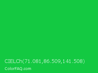 CIELCh 71.081,86.509,141.508 Color is a normal green color and the nearest color is Dark Pastel Green #03c03c. Hex code #13c942 and RGB value is rgb(19,201,66). In RGB color space, this color is composed of 7% red, 79% green, 26% blue, In CMYK color space, this color is composed of 91% cyan, 0% magenta, 67% yellow , 21% black , In HSL color space, this color has a hue angle of 135° , 83% saturation and 43% lightness.