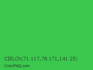 CIELCh 71.117,78.171,141.25 Color is a normal green color and the nearest color is Lime Green #32cd32. Hex code #3cc74e and RGB value is rgb(60,199,78). In RGB color space, this color is composed of 24% red, 78% green, 31% blue, In CMYK color space, this color is composed of 70% cyan, 0% magenta, 61% yellow , 22% black , In HSL color space, this color has a hue angle of 128° , 55% saturation and 51% lightness.