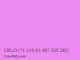 CIELCh 71.119,63.687,325.282 Color is a light magenta color and the nearest color is Lavender Magenta #ee82ee. Hex code #ec8af1 and RGB value is rgb(236,138,241). In RGB color space, this color is composed of 93% red, 54% green, 95% blue, In CMYK color space, this color is composed of 2% cyan, 43% magenta, 0% yellow , 5% black , In HSL color space, this color has a hue angle of 297° , 79% saturation and 74% lightness.