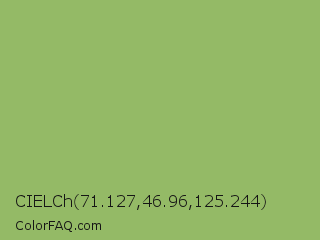 CIELCh 71.127,46.96,125.244 Color is a normal green color and the nearest color is Olivine #9ab973. Hex code #94ba66 and RGB value is rgb(148,186,102). In RGB color space, this color is composed of 58% red, 73% green, 40% blue, In CMYK color space, this color is composed of 20% cyan, 0% magenta, 45% yellow , 27% black , In HSL color space, this color has a hue angle of 87° , 38% saturation and 56% lightness.