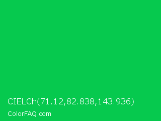 CIELCh 71.12,82.838,143.936 Color is a normal green color and the nearest color is Malachite #0bda51. Hex code #06c94e and RGB value is rgb(6,201,78). In RGB color space, this color is composed of 2% red, 79% green, 31% blue, In CMYK color space, this color is composed of 97% cyan, 0% magenta, 61% yellow , 21% black , In HSL color space, this color has a hue angle of 142° , 94% saturation and 41% lightness.