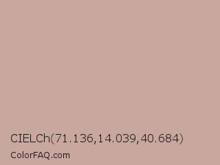 CIELCh 71.136,14.039,40.684 Color is a light red color and the nearest color is Eunry #cfa39d. Hex code #c8a79e and RGB value is rgb(200,167,158). In RGB color space, this color is composed of 78% red, 65% green, 62% blue, In CMYK color space, this color is composed of 0% cyan, 17% magenta, 21% yellow , 22% black , In HSL color space, this color has a hue angle of 13° , 28% saturation and 70% lightness.