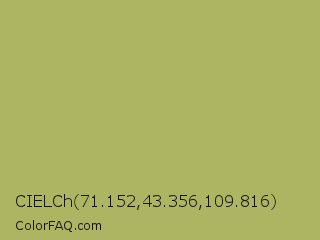 CIELCh 71.152,43.356,109.816 Color is a normal yellow color and the nearest color is Olive Green #b5b35c. Hex code #adb462 and RGB value is rgb(173,180,98). In RGB color space, this color is composed of 68% red, 71% green, 38% blue, In CMYK color space, this color is composed of 4% cyan, 0% magenta, 46% yellow , 29% black , In HSL color space, this color has a hue angle of 65° , 35% saturation and 55% lightness.