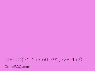 CIELCh 71.153,60.791,328.452 Color is a light magenta color and the nearest color is Lavender Magenta #ee82ee. Hex code #ef8ae9 and RGB value is rgb(239,138,233). In RGB color space, this color is composed of 94% red, 54% green, 91% blue, In CMYK color space, this color is composed of 0% cyan, 42% magenta, 3% yellow , 6% black , In HSL color space, this color has a hue angle of 304° , 76% saturation and 74% lightness.