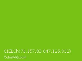 CIELCh 71.157,83.647,125.012 Color is a normal green color and the nearest color is Lima #76bd17. Hex code #75c214 and RGB value is rgb(117,194,20). In RGB color space, this color is composed of 46% red, 76% green, 8% blue, In CMYK color space, this color is composed of 40% cyan, 0% magenta, 90% yellow , 24% black , In HSL color space, this color has a hue angle of 87° , 81% saturation and 42% lightness.