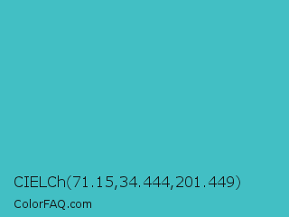 CIELCh 71.15,34.444,201.449 Color is a normal cyan color and the nearest color is Sea Serpent #4bc7cf. Hex code #42bfc4 and RGB value is rgb(66,191,196). In RGB color space, this color is composed of 26% red, 75% green, 77% blue, In CMYK color space, this color is composed of 66% cyan, 3% magenta, 0% yellow , 23% black , In HSL color space, this color has a hue angle of 182° , 52% saturation and 51% lightness.
