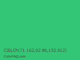 CIELCh 71.162,62.86,152.612 Color is a normal green color and the nearest color is UFO Green #3cd070. Hex code #33c677 and RGB value is rgb(51,198,119). In RGB color space, this color is composed of 20% red, 78% green, 47% blue, In CMYK color space, this color is composed of 74% cyan, 0% magenta, 40% yellow , 22% black , In HSL color space, this color has a hue angle of 148° , 59% saturation and 49% lightness.