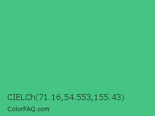 CIELCh 71.16,54.553,155.43 Color is a normal green color and the nearest color is Ocean Green #48bf91. Hex code #46c483 and RGB value is rgb(70,196,131). In RGB color space, this color is composed of 27% red, 77% green, 51% blue, In CMYK color space, this color is composed of 64% cyan, 0% magenta, 33% yellow , 23% black , In HSL color space, this color has a hue angle of 149° , 52% saturation and 52% lightness.