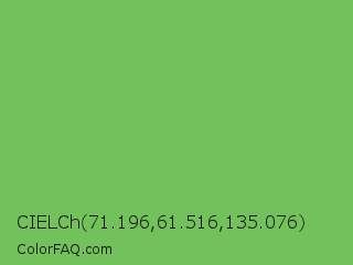 CIELCh 71.196,61.516,135.076 Color is a normal green color and the nearest color is Mantis #74c365. Hex code #72c15b and RGB value is rgb(114,193,91). In RGB color space, this color is composed of 45% red, 76% green, 36% blue, In CMYK color space, this color is composed of 41% cyan, 0% magenta, 53% yellow , 24% black , In HSL color space, this color has a hue angle of 106° , 45% saturation and 56% lightness.