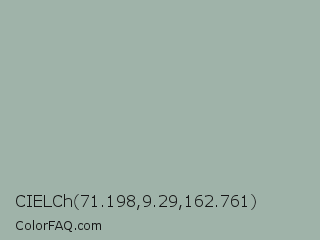 CIELCh 71.198,9.29,162.761 Color is a light green color and the nearest color is Edward #a2aeab. Hex code #9fb3a9 and RGB value is rgb(159,179,169). In RGB color space, this color is composed of 62% red, 70% green, 66% blue, In CMYK color space, this color is composed of 11% cyan, 0% magenta, 6% yellow , 30% black , In HSL color space, this color has a hue angle of 150° , 12% saturation and 66% lightness.