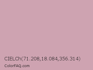 CIELCh 71.208,18.084,356.314 Color is a light rose color and the nearest color is Careys Pink #d29eaa. Hex code #cea3b1 and RGB value is rgb(206,163,177). In RGB color space, this color is composed of 81% red, 64% green, 69% blue, In CMYK color space, this color is composed of 0% cyan, 21% magenta, 14% yellow , 19% black , In HSL color space, this color has a hue angle of 340° , 30% saturation and 72% lightness.
