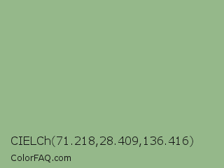 CIELCh 71.218,28.409,136.416 Color is a light green color and the nearest color is Dark Sea Green #8fbc8f. Hex code #95b88a and RGB value is rgb(149,184,138). In RGB color space, this color is composed of 58% red, 72% green, 54% blue, In CMYK color space, this color is composed of 19% cyan, 0% magenta, 25% yellow , 28% black , In HSL color space, this color has a hue angle of 106° , 24% saturation and 63% lightness.