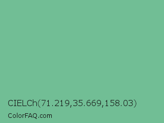 CIELCh 71.219,35.669,158.03 Color is a normal green color and the nearest color is Silver Tree #66b58f. Hex code #71be95 and RGB value is rgb(113,190,149). In RGB color space, this color is composed of 44% red, 75% green, 58% blue, In CMYK color space, this color is composed of 41% cyan, 0% magenta, 22% yellow , 25% black , In HSL color space, this color has a hue angle of 148° , 37% saturation and 59% lightness.