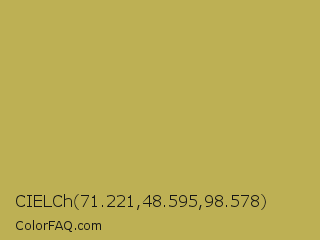 CIELCh 71.221,48.595,98.578 Color is a normal yellow color and the nearest color is Vegas Gold #c5b358. Hex code #bdb054 and RGB value is rgb(189,176,84). In RGB color space, this color is composed of 74% red, 69% green, 33% blue, In CMYK color space, this color is composed of 0% cyan, 7% magenta, 56% yellow , 26% black , In HSL color space, this color has a hue angle of 53° , 44% saturation and 54% lightness.