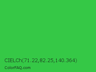CIELCh 71.22,82.25,140.364 Color is a normal green color and the nearest color is Lime Green #32cd32. Hex code #35c846 and RGB value is rgb(53,200,70). In RGB color space, this color is composed of 21% red, 78% green, 27% blue, In CMYK color space, this color is composed of 74% cyan, 0% magenta, 65% yellow , 22% black , In HSL color space, this color has a hue angle of 127° , 58% saturation and 50% lightness.