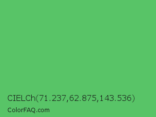CIELCh 71.237,62.875,143.536 Color is a normal green color and the nearest color is Fern #63b76c. Hex code #58c467 and RGB value is rgb(88,196,103). In RGB color space, this color is composed of 35% red, 77% green, 40% blue, In CMYK color space, this color is composed of 55% cyan, 0% magenta, 47% yellow , 23% black , In HSL color space, this color has a hue angle of 128° , 48% saturation and 56% lightness.