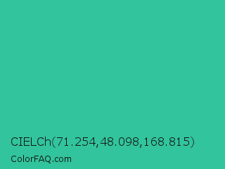CIELCh 71.254,48.098,168.815 Color is a normal cyan color and the nearest color is Shamrock #33cc99. Hex code #32c49c and RGB value is rgb(50,196,156). In RGB color space, this color is composed of 20% red, 77% green, 61% blue, In CMYK color space, this color is composed of 74% cyan, 0% magenta, 20% yellow , 23% black , In HSL color space, this color has a hue angle of 164° , 59% saturation and 48% lightness.