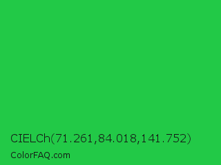 CIELCh 71.261,84.018,141.752 Color is a normal green color and the nearest color is Lime Green #32cd32. Hex code #22c947 and RGB value is rgb(34,201,71). In RGB color space, this color is composed of 13% red, 79% green, 28% blue, In CMYK color space, this color is composed of 83% cyan, 0% magenta, 65% yellow , 21% black , In HSL color space, this color has a hue angle of 133° , 71% saturation and 46% lightness.