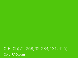 CIELCh 71.268,92.234,131.416 Color is a normal green color and the nearest color is Harlequin Green #46cb18. Hex code #50c70c and RGB value is rgb(80,199,12). In RGB color space, this color is composed of 31% red, 78% green, 5% blue, In CMYK color space, this color is composed of 60% cyan, 0% magenta, 94% yellow , 22% black , In HSL color space, this color has a hue angle of 98° , 89% saturation and 41% lightness.