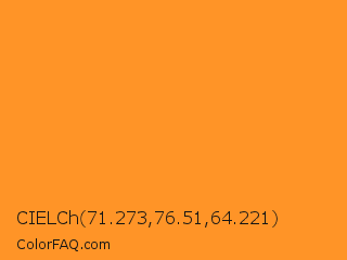 CIELCh 71.273,76.51,64.221 Color is a normal orange color and the nearest color is Sunshade #ff9e2c. Hex code #ff9427 and RGB value is rgb(255,148,39). In RGB color space, this color is composed of 100% red, 58% green, 15% blue, In CMYK color space, this color is composed of 0% cyan, 42% magenta, 85% yellow , 0% black , In HSL color space, this color has a hue angle of 30° , 100% saturation and 58% lightness.