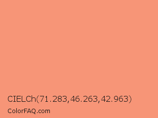 CIELCh 71.283,46.263,42.963 Color is a light red color and the nearest color is Vivid Tangerine #ff9980. Hex code #f79577 and RGB value is rgb(247,149,119). In RGB color space, this color is composed of 97% red, 58% green, 47% blue, In CMYK color space, this color is composed of 0% cyan, 40% magenta, 52% yellow , 3% black , In HSL color space, this color has a hue angle of 14° , 89% saturation and 72% lightness.