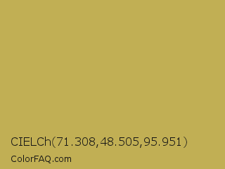 CIELCh 71.308,48.505,95.951 Color is a normal yellow color and the nearest color is Vegas Gold #c5b358. Hex code #c1af54 and RGB value is rgb(193,175,84). In RGB color space, this color is composed of 76% red, 69% green, 33% blue, In CMYK color space, this color is composed of 0% cyan, 9% magenta, 56% yellow , 24% black , In HSL color space, this color has a hue angle of 50° , 47% saturation and 54% lightness.