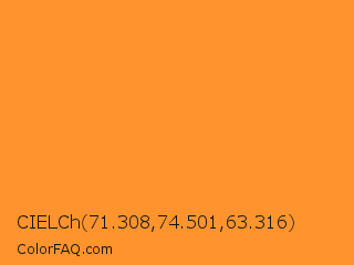 CIELCh 71.308,74.501,63.316 Color is a normal orange color and the nearest color is Neon Carrot Crayola #ff9933. Hex code #ff942e and RGB value is rgb(255,148,46). In RGB color space, this color is composed of 100% red, 58% green, 18% blue, In CMYK color space, this color is composed of 0% cyan, 42% magenta, 82% yellow , 0% black , In HSL color space, this color has a hue angle of 29° , 100% saturation and 59% lightness.