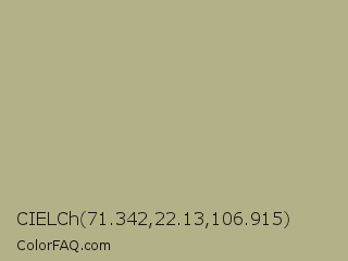 CIELCh 71.342,22.13,106.915 Color is a light yellow color and the nearest color is Swamp Green #acb78e. Hex code #b2b188 and RGB value is rgb(178,177,136). In RGB color space, this color is composed of 70% red, 69% green, 53% blue, In CMYK color space, this color is composed of 0% cyan, 1% magenta, 24% yellow , 30% black , In HSL color space, this color has a hue angle of 59° , 21% saturation and 62% lightness.