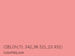 CIELCh 71.342,38.521,23.932 Color is a light red color and the nearest color is Sea Pink #ed989e. Hex code #f39594 and RGB value is rgb(243,149,148). In RGB color space, this color is composed of 95% red, 58% green, 58% blue, In CMYK color space, this color is composed of 0% cyan, 39% magenta, 39% yellow , 5% black , In HSL color space, this color has a hue angle of 1° , 80% saturation and 77% lightness.