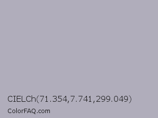 CIELCh 71.354,7.741,299.049 Color is a light indigo color and the nearest color is Bombay #afb1b8. Hex code #b0adbb and RGB value is rgb(176,173,187). In RGB color space, this color is composed of 69% red, 68% green, 73% blue, In CMYK color space, this color is composed of 6% cyan, 7% magenta, 0% yellow , 27% black , In HSL color space, this color has a hue angle of 253° , 9% saturation and 71% lightness.