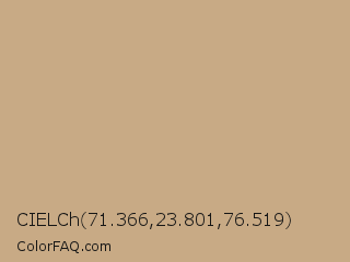 CIELCh 71.366,23.801,76.519 Color is a light orange color and the nearest color is Light French Beige #c8ad7f. Hex code #c8aa85 and RGB value is rgb(200,170,133). In RGB color space, this color is composed of 78% red, 67% green, 52% blue, In CMYK color space, this color is composed of 0% cyan, 15% magenta, 34% yellow , 22% black , In HSL color space, this color has a hue angle of 33° , 38% saturation and 65% lightness.